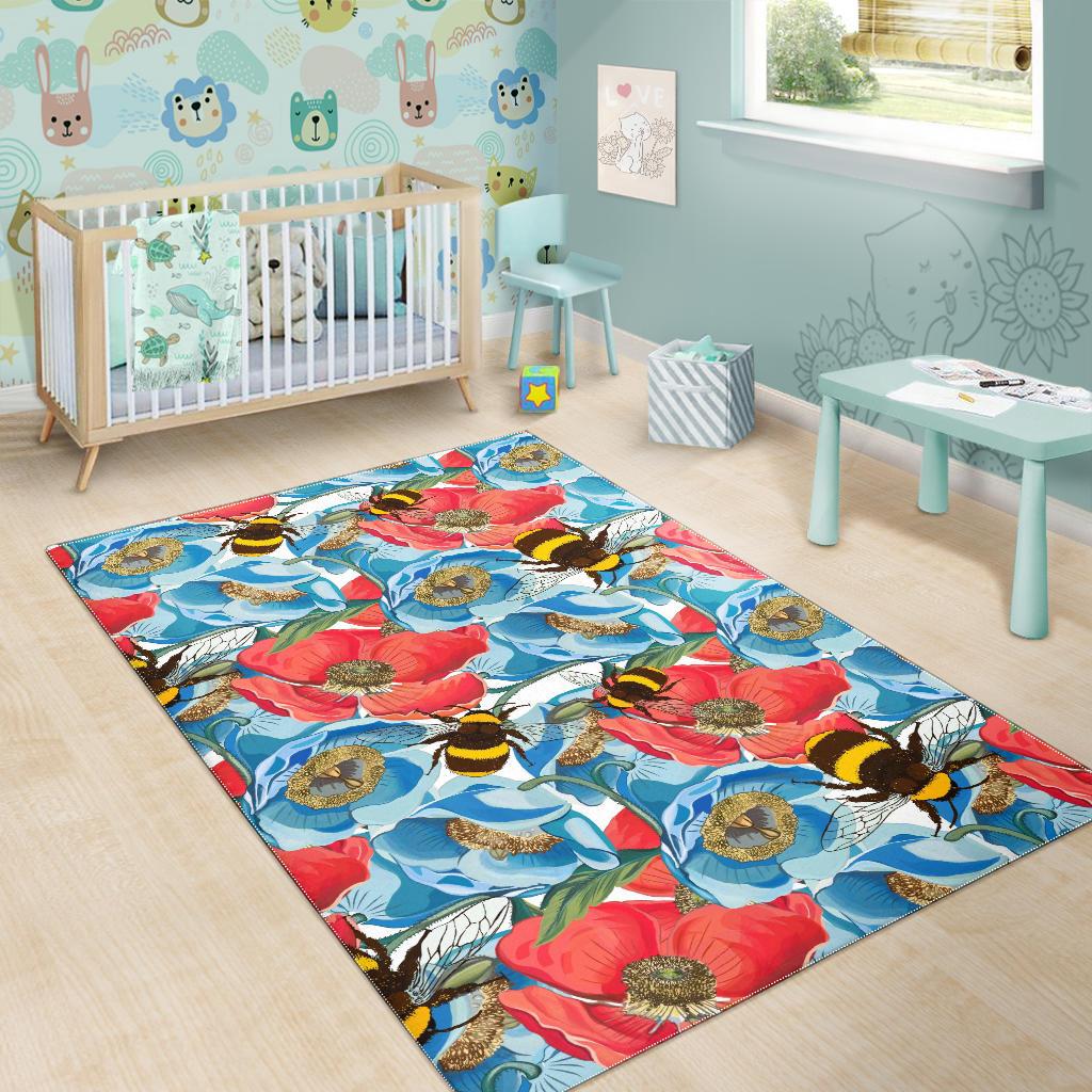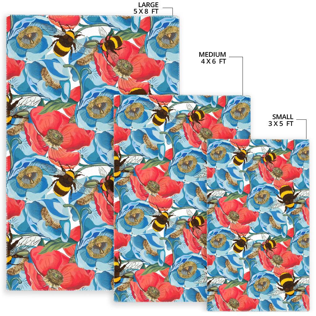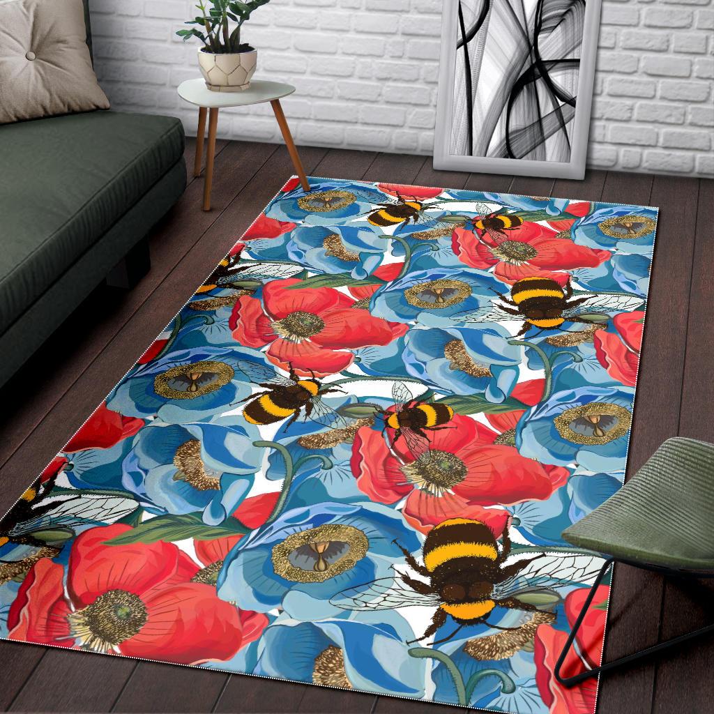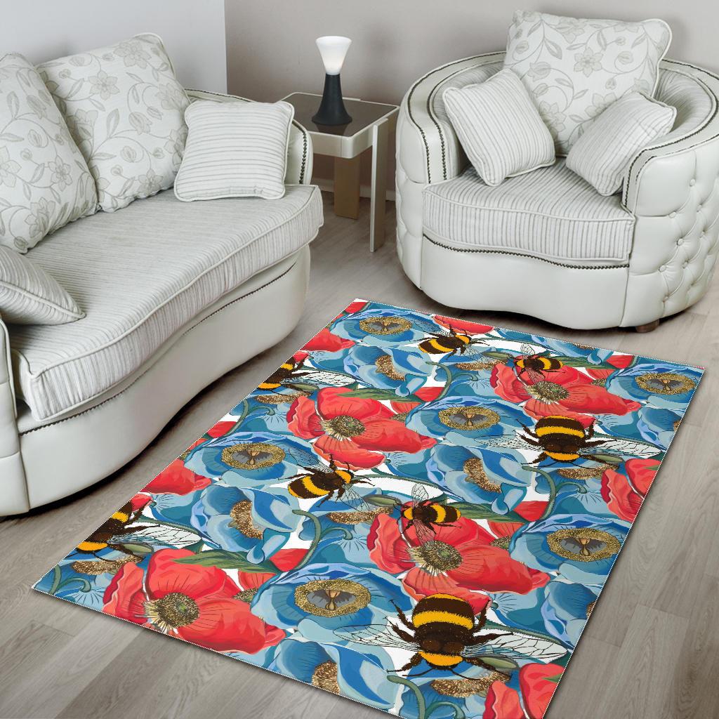 Bee Red and Blue Hibiscus Pattern Area Rug