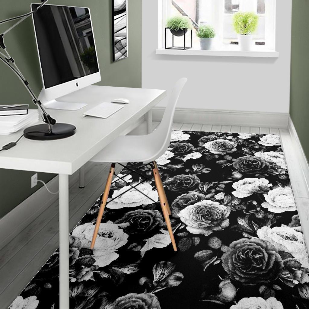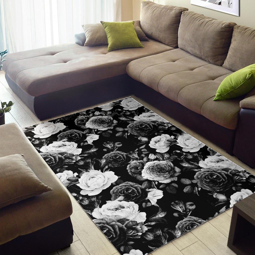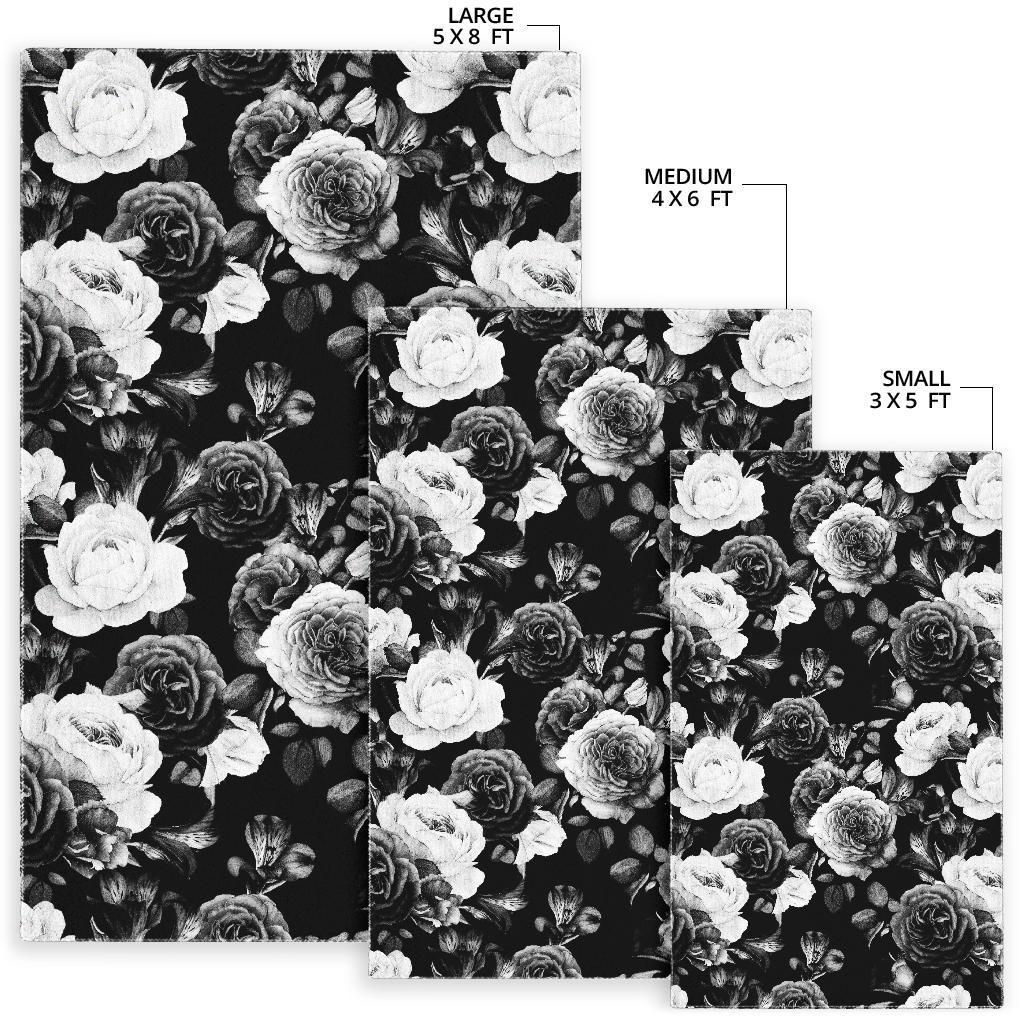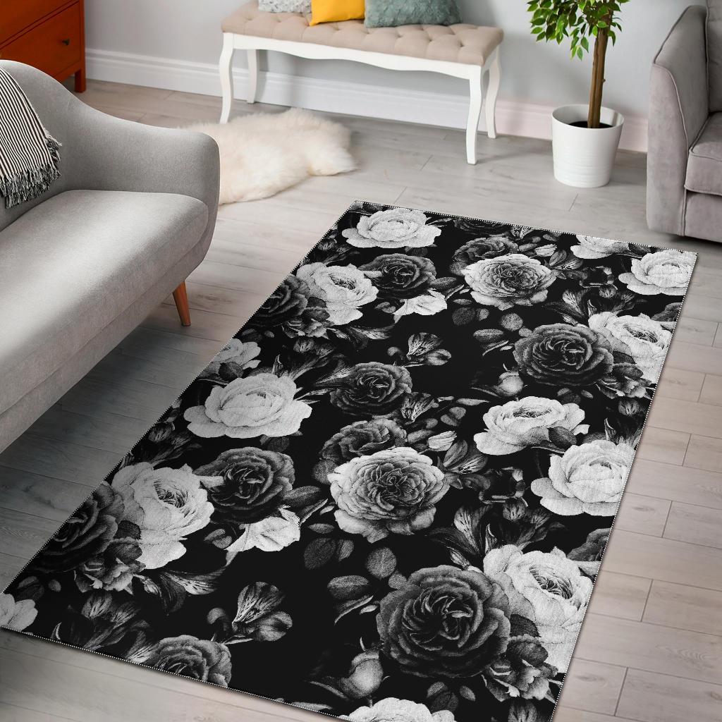 Black White Rose Floral Pattern Print Area Rug