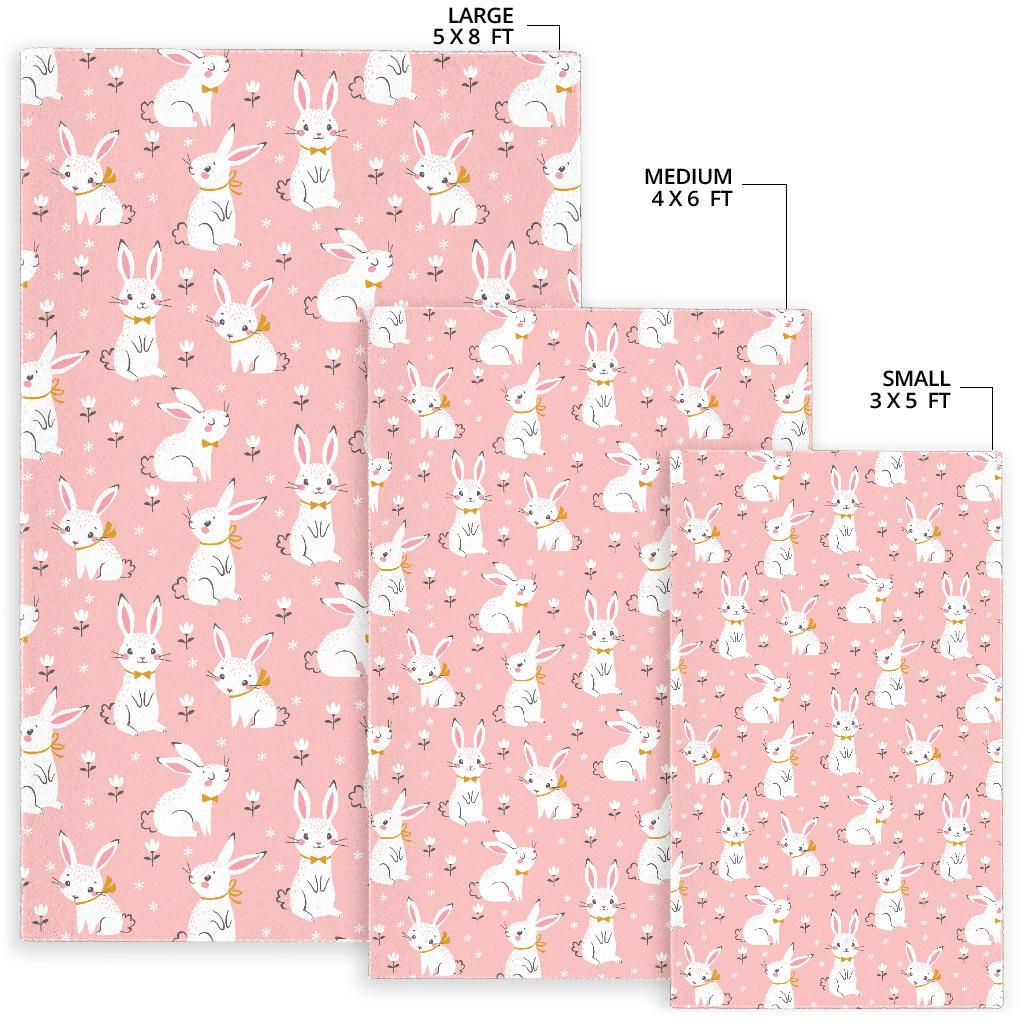 Cute white rabbit flower pink background Area Rug