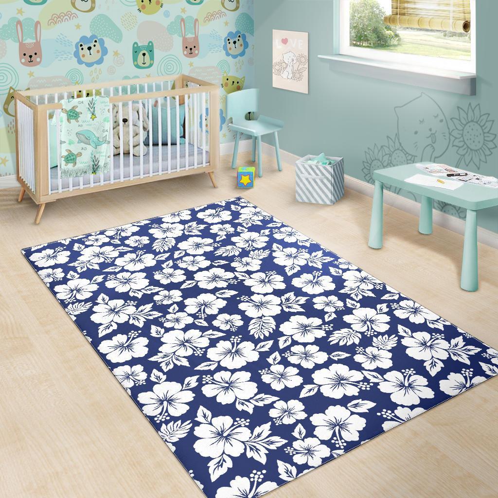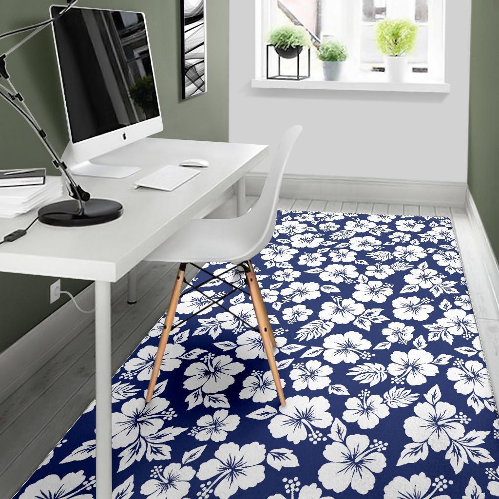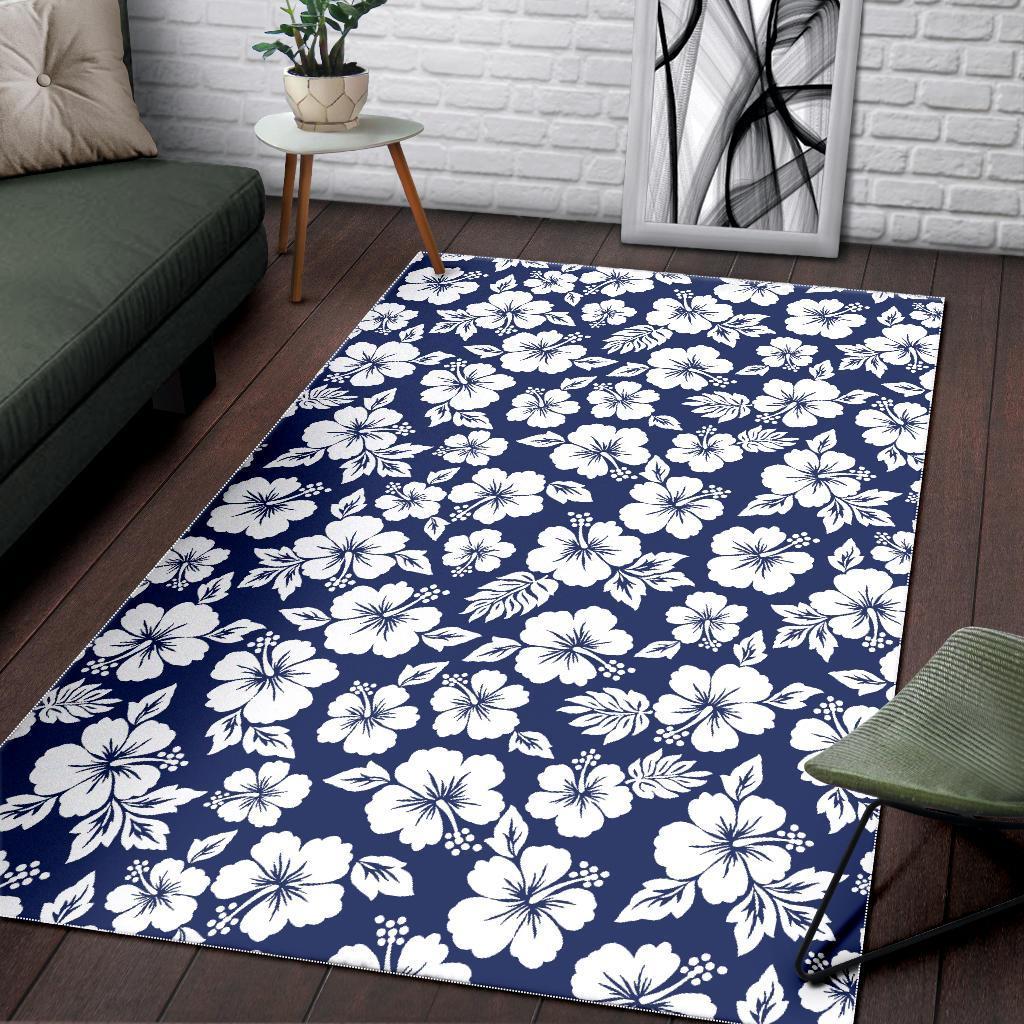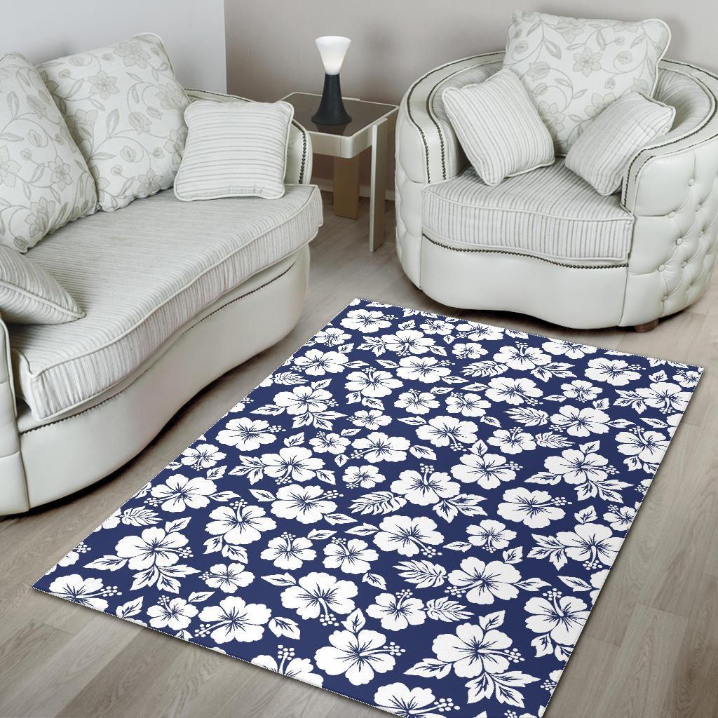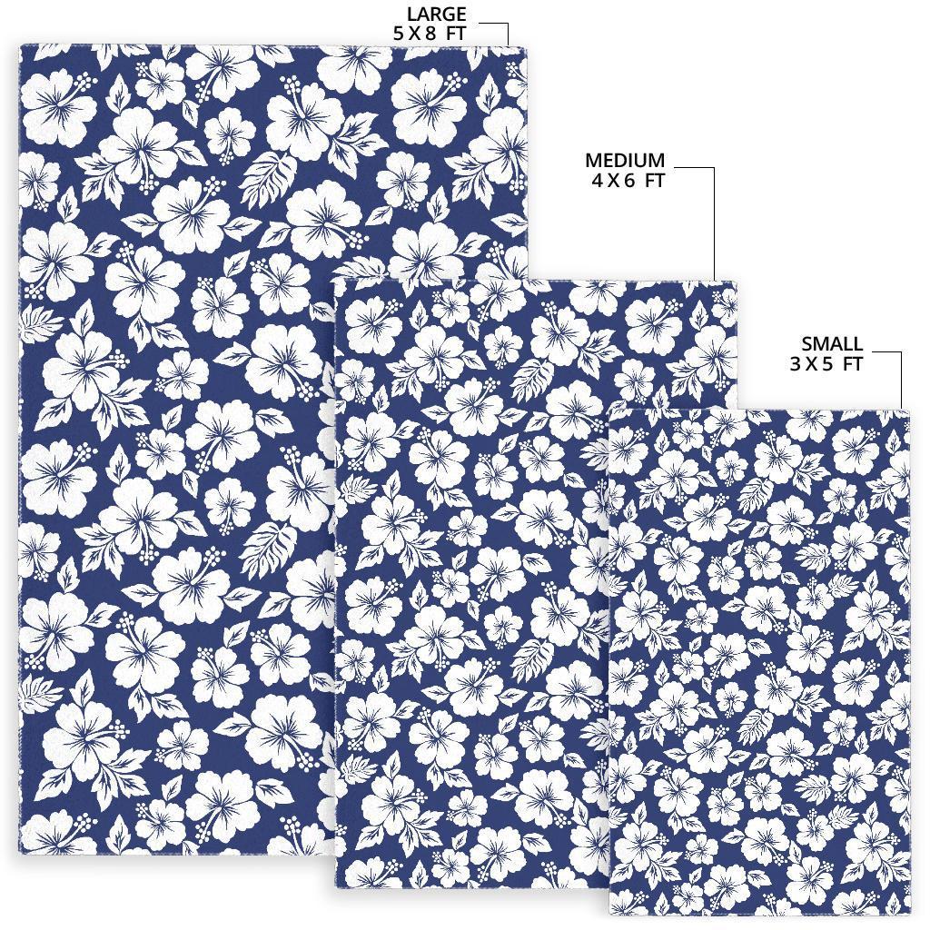 White Blue Hibiscus Floral Pattern Print Area Rug